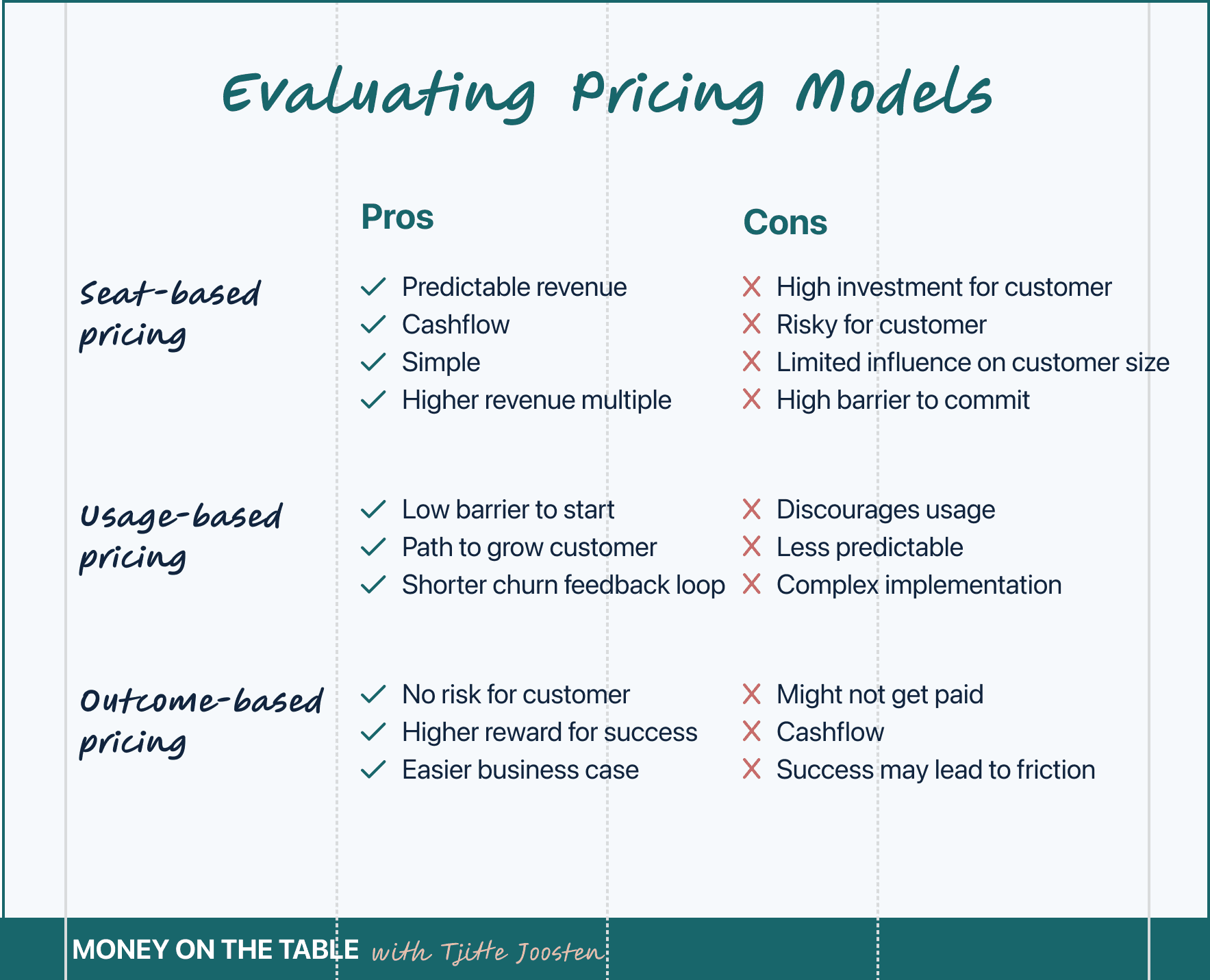 Why are hybrid models the real opportunity? Because every pricing model directly impacts (1) the earning potential per customer, (2) the ease of selling, and (3) your company valuation. To explain that, we first need to examine the pros and cons of the most popular pricing models in SaaS today: seat-, usage-, and outcome-based.