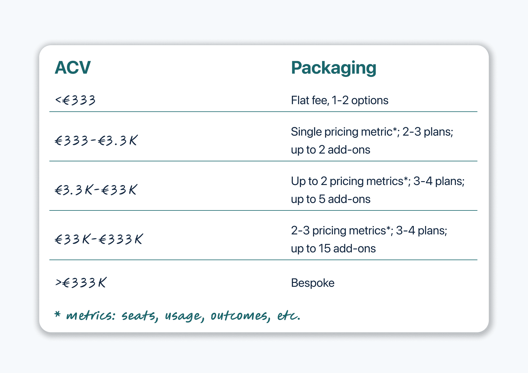 Up to 3 pricing metrics (seats, usage, outcome, etc.)